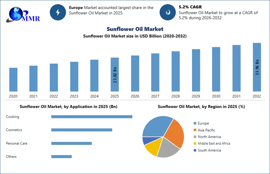 The global Sunflower Oil Market is witnessing steady and sustainable growth, fueled by rising consumer awareness regarding healthier edible oils, expanding applications across food and non-food sectors, and increasing demand for plant-based products. According to the latest market analysis, the Sunflower Oil Market size was valued at USD 23.82 billion in 2025 and is projected to grow at a CAGR of 5.2% from 2025 to 2032, reaching nearly USD 33.96 billion by 2032.